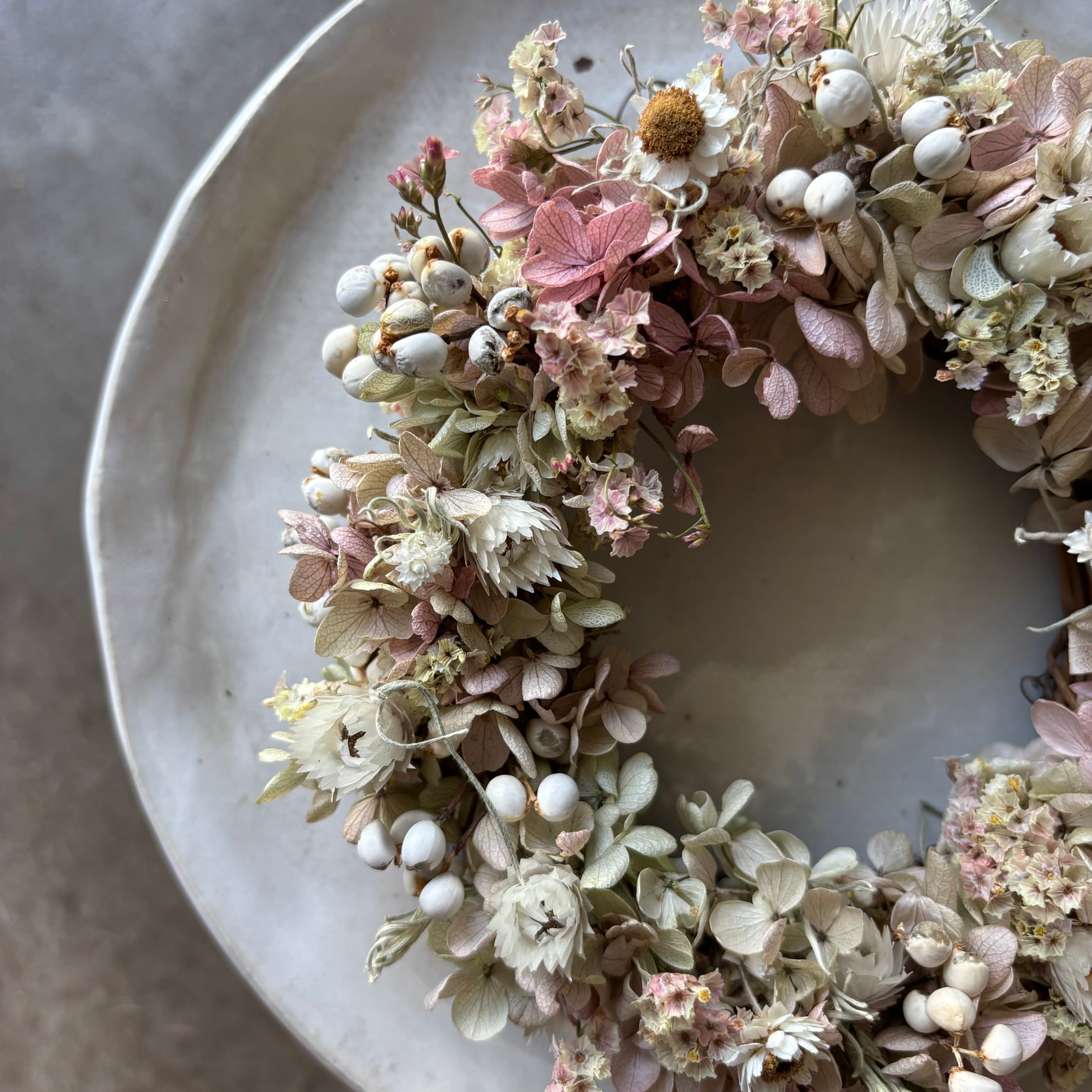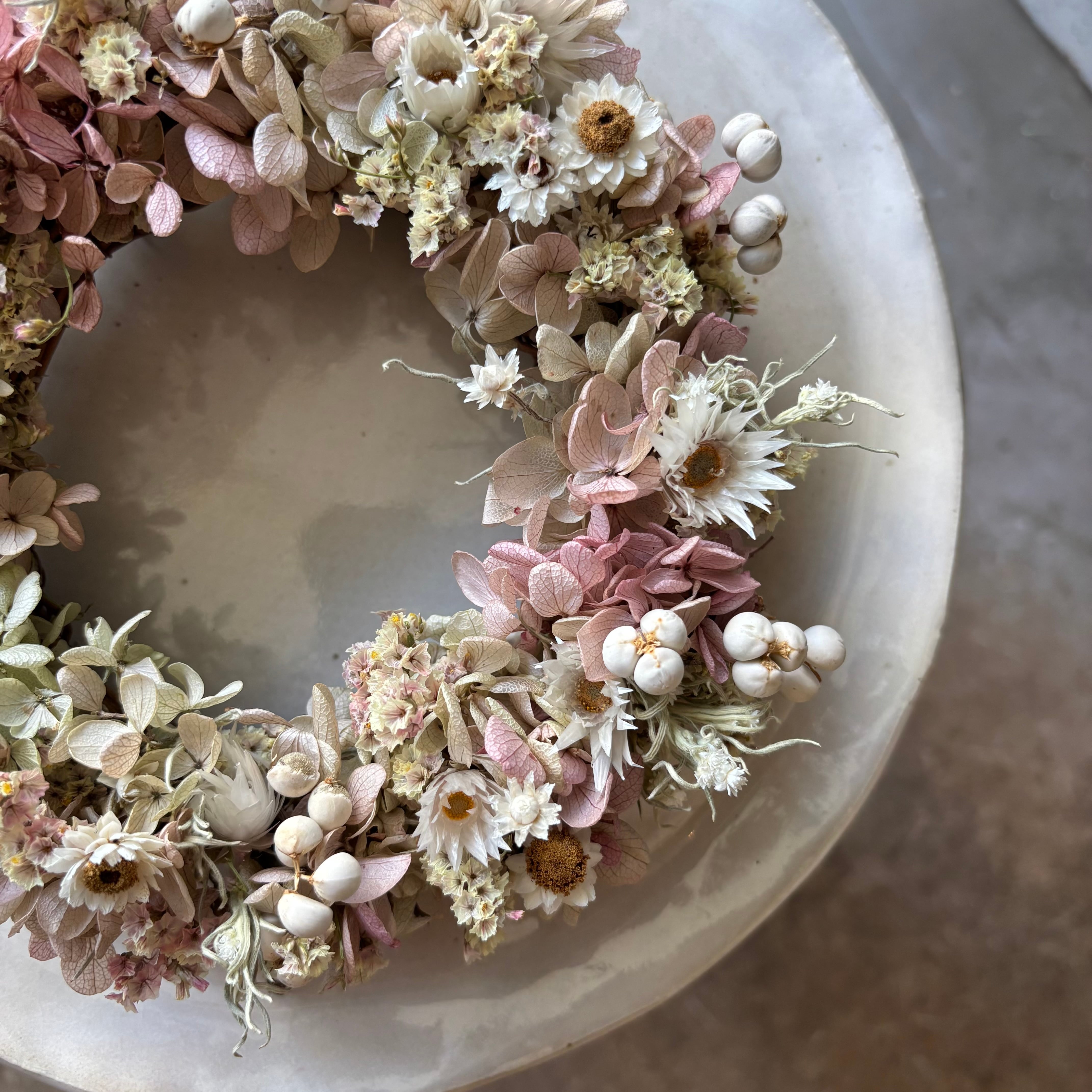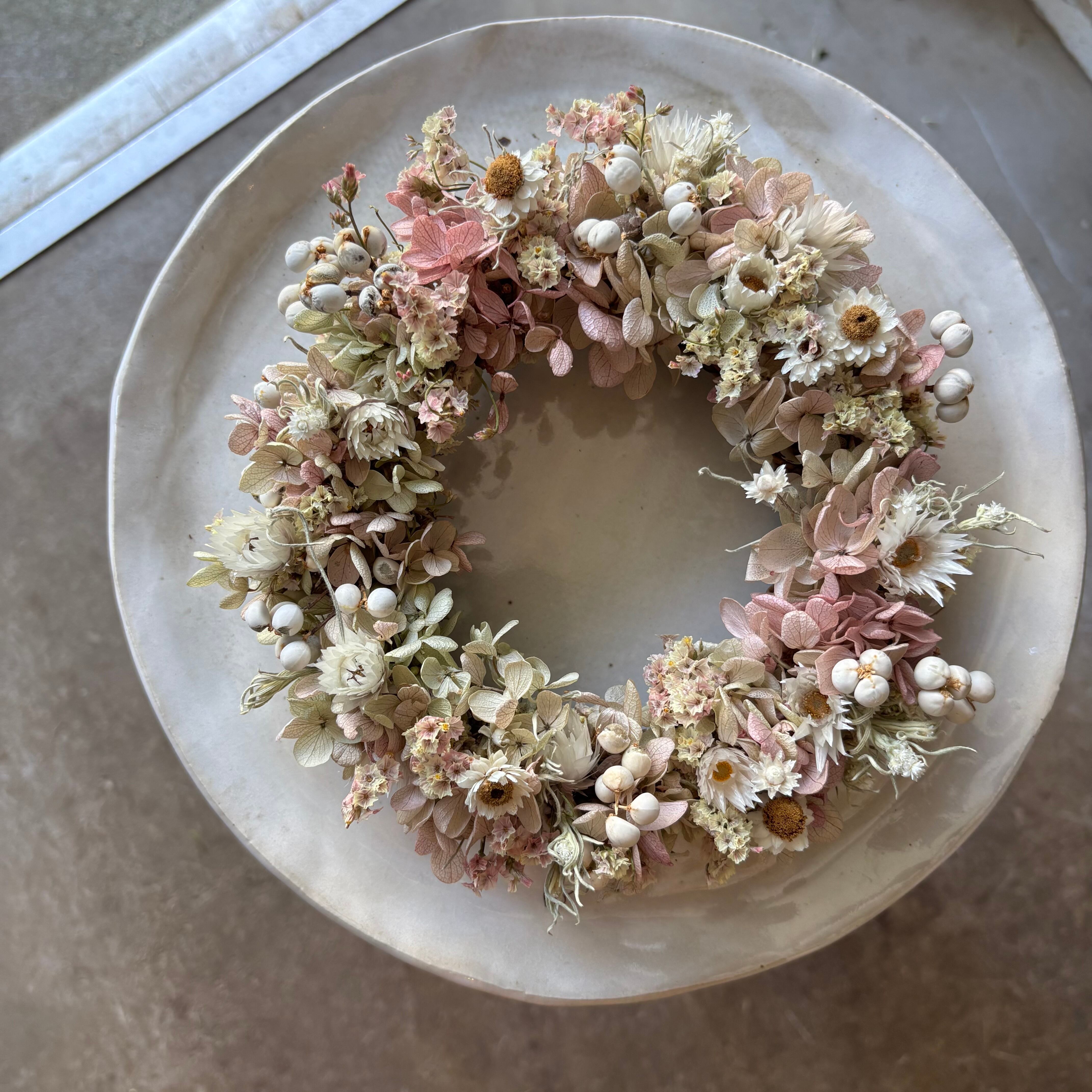 アジサイのプリザーブドフラワーとドライフラワーを使ったリース