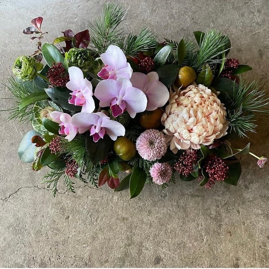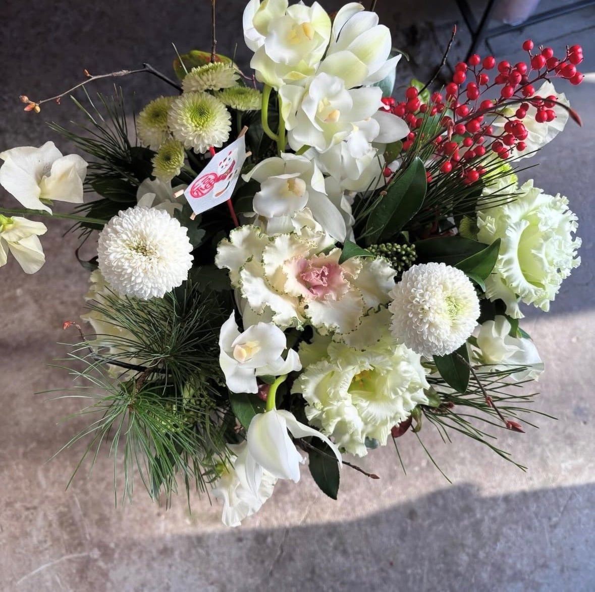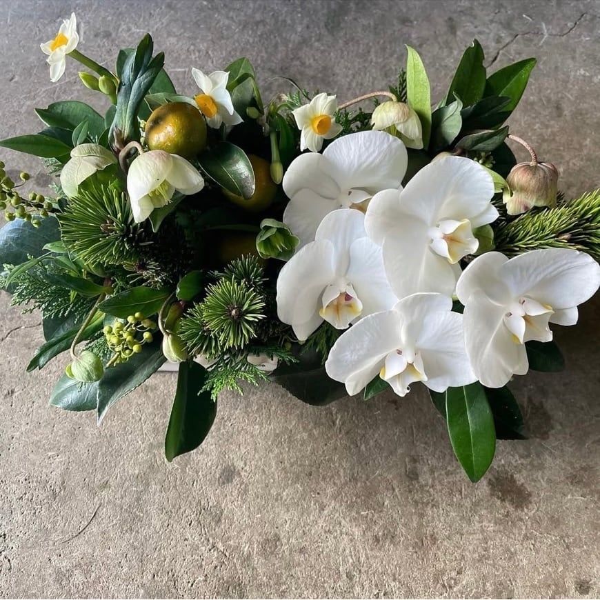 ・material 菊、葉牡丹、南天の実、松、ミディファレノ、シンビジューム、ラナンキュラスなど