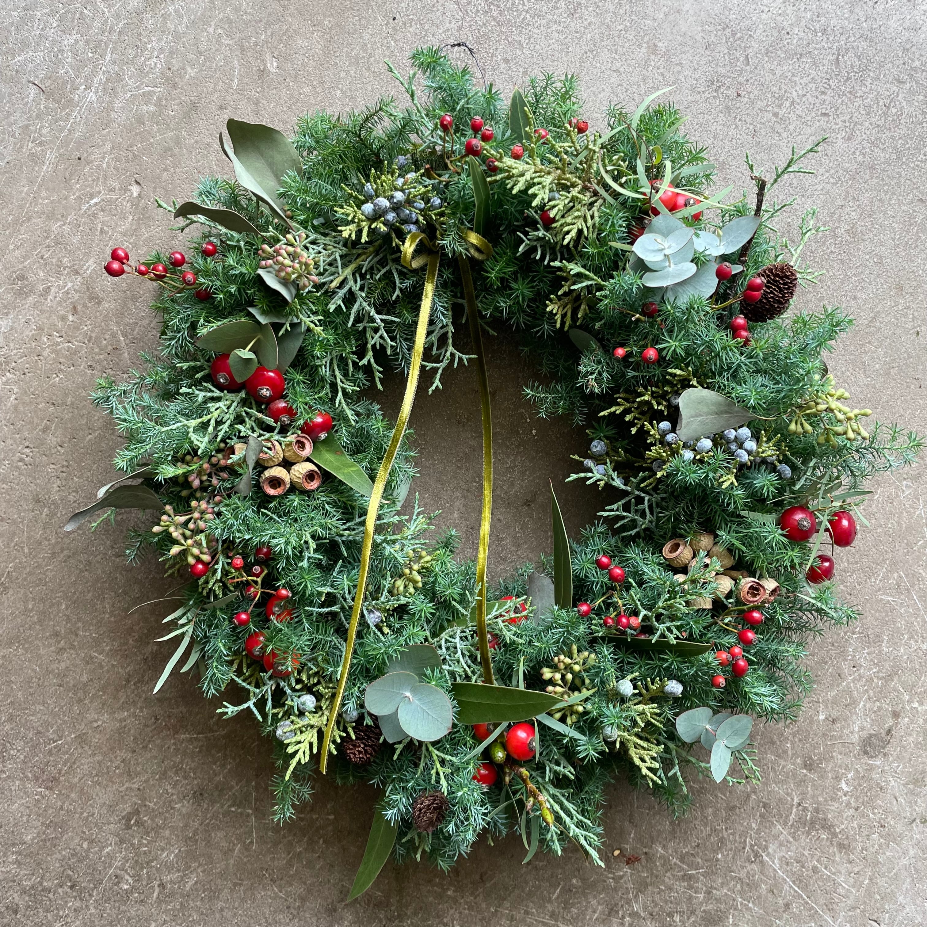 針葉樹と実物のリース。