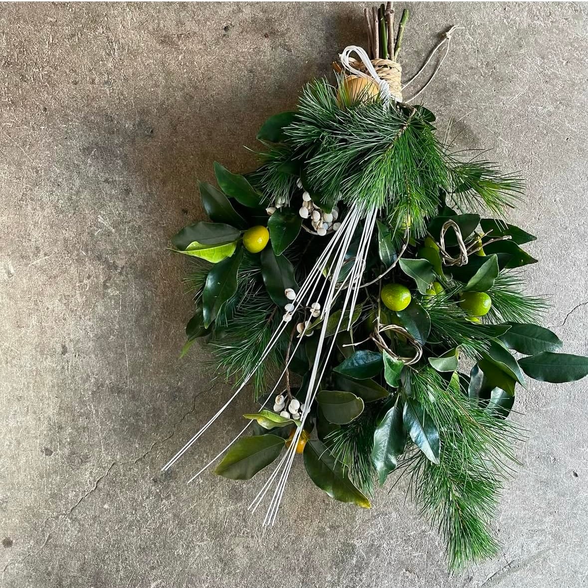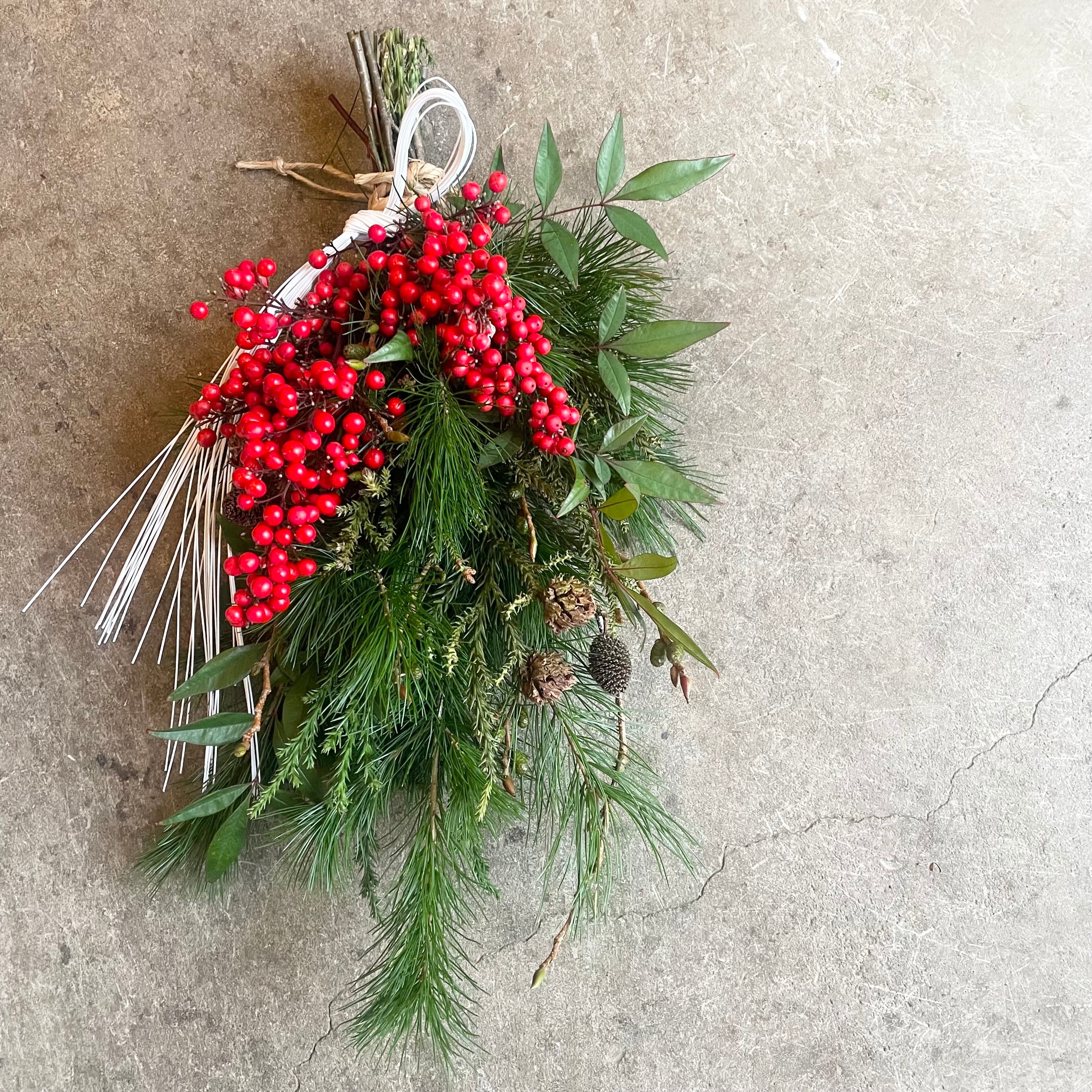 ・material : 松、ヤシャ、南天の実、ナンキンハゼ、水引きなど