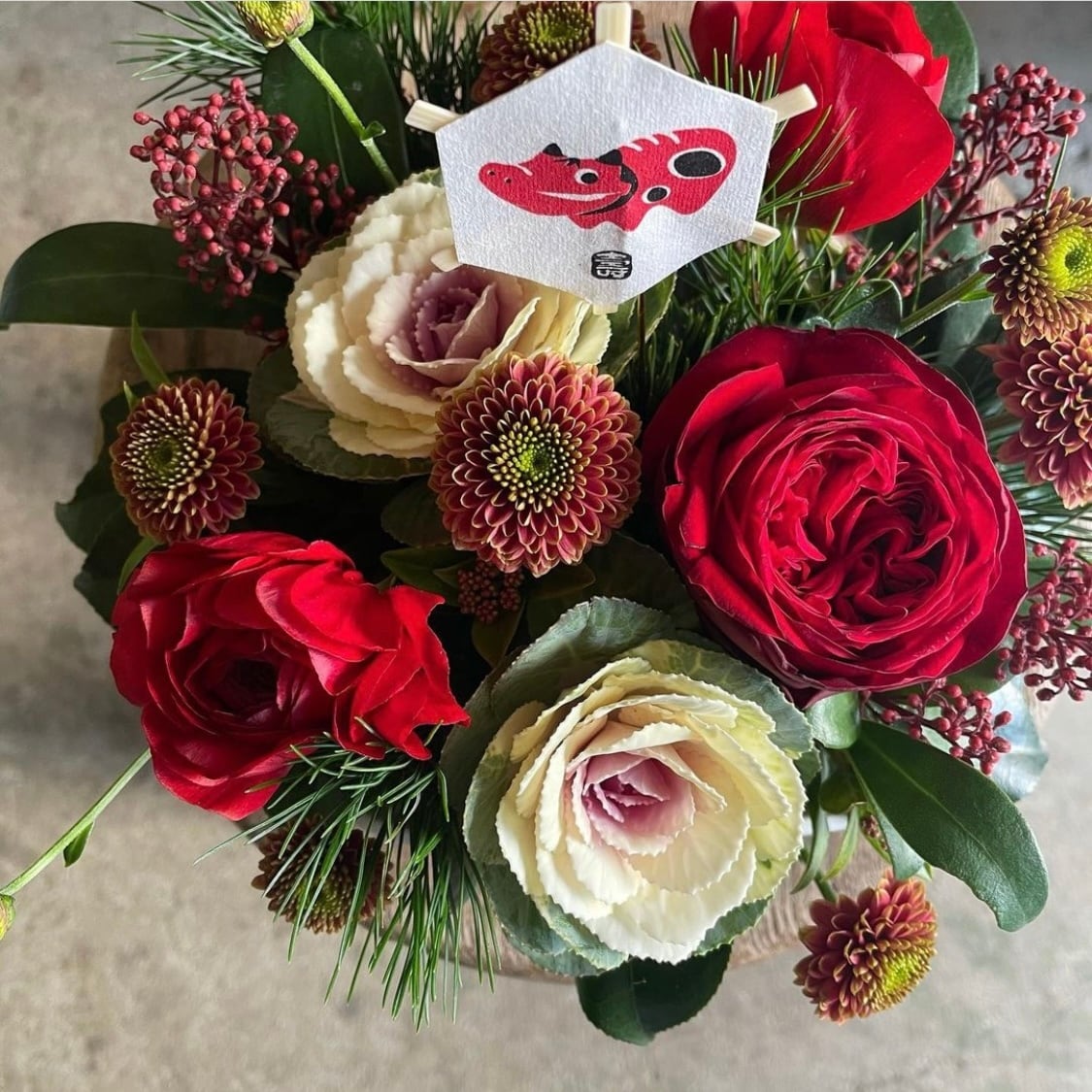 ・material 菊、葉牡丹、南天の実、松、ラナンキュラス、ガーベラ など